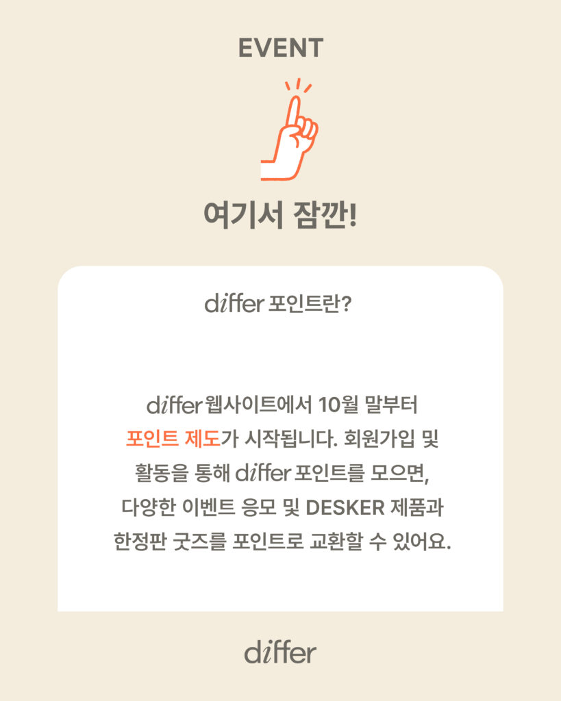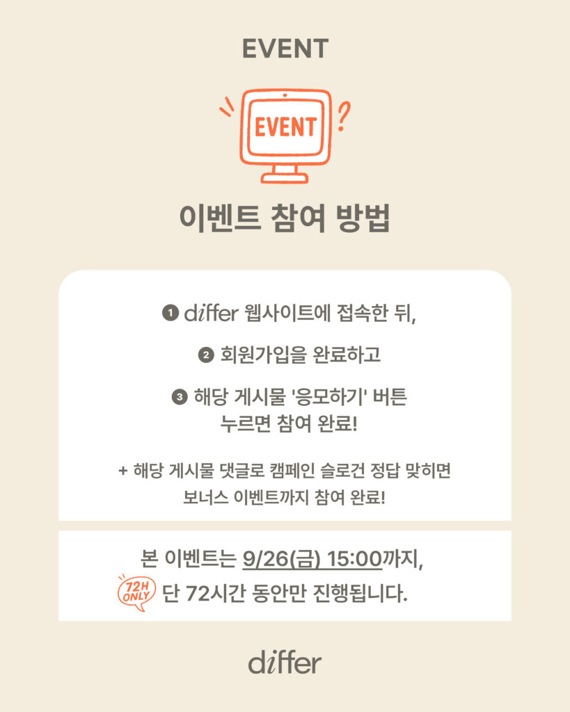 ⁕ 이미 differ 회원이라면, 이벤트 기간 내 로그인 후 추가 정보를 입력 > 해당 게시물 상단의 ‘응모하기’ 버튼을 눌러야 혜택을 받으실 수 있어요.