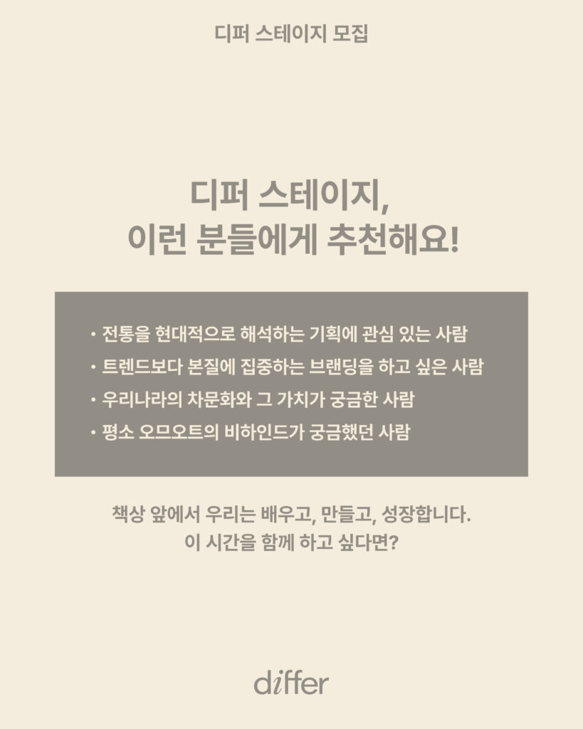 저는 디퍼를 통해 오므오트에 대해 알게되었습니다. 이번 디퍼 스테이지를 통해 브랜드가 문화와 감성을 연결하는 방식에 대해 깊이 배우고 싶습니다.