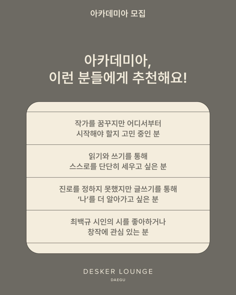 데스커 라운지 대구에서 진행하는 11월 아카데미아 모집을 시작합니다.