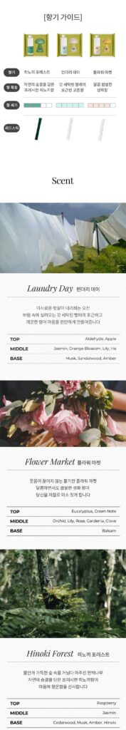히노끼 포레스트향이라니! 저는 히노끼향 하면 뭔가 아주 청결하게 새로 나온 느낌이 들어서 좋아요! 고급진 느낌, 앞의 것들에 대한 정리 그런 맑은 느낌일까요? 너무 기대되네요!