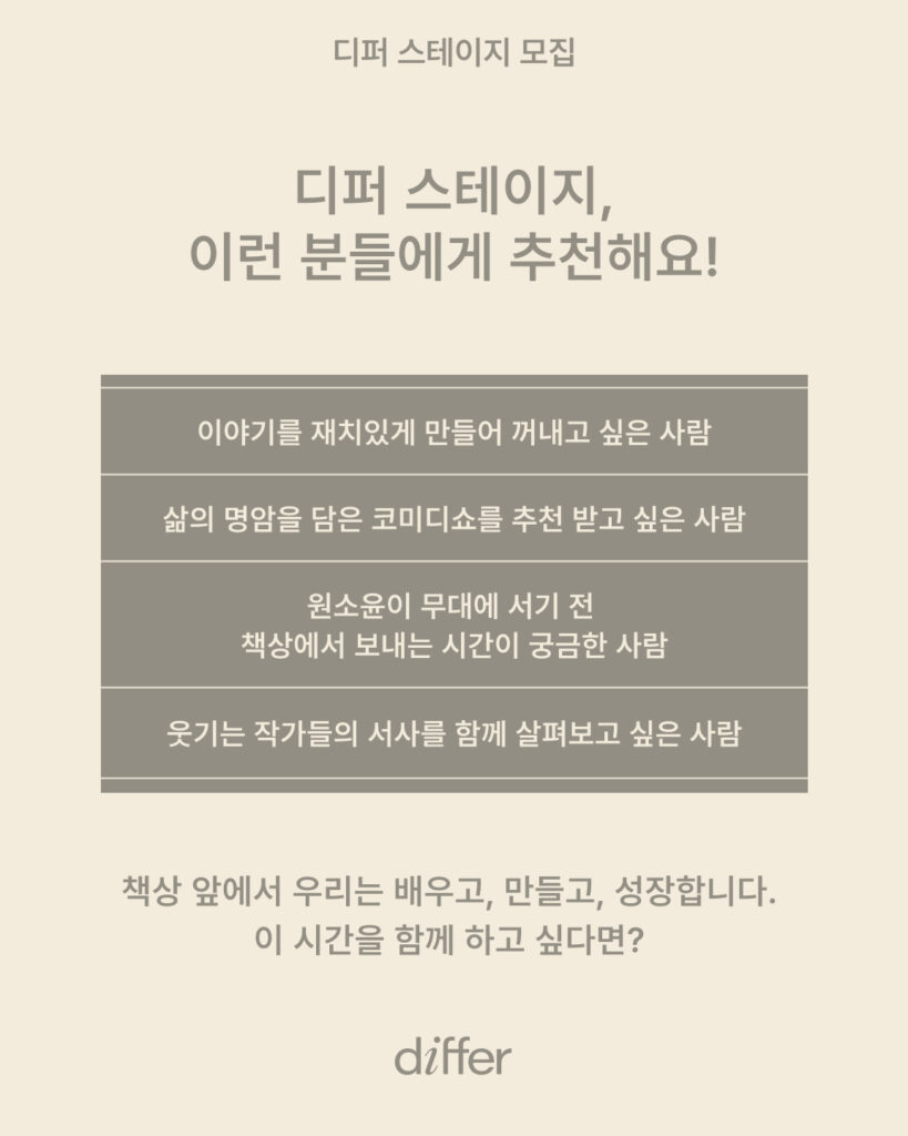‘디퍼 스테이지’는 책상을 무대로 깊이 있는 배움과 연결을 만드는 오프라인 워크숍입니다.