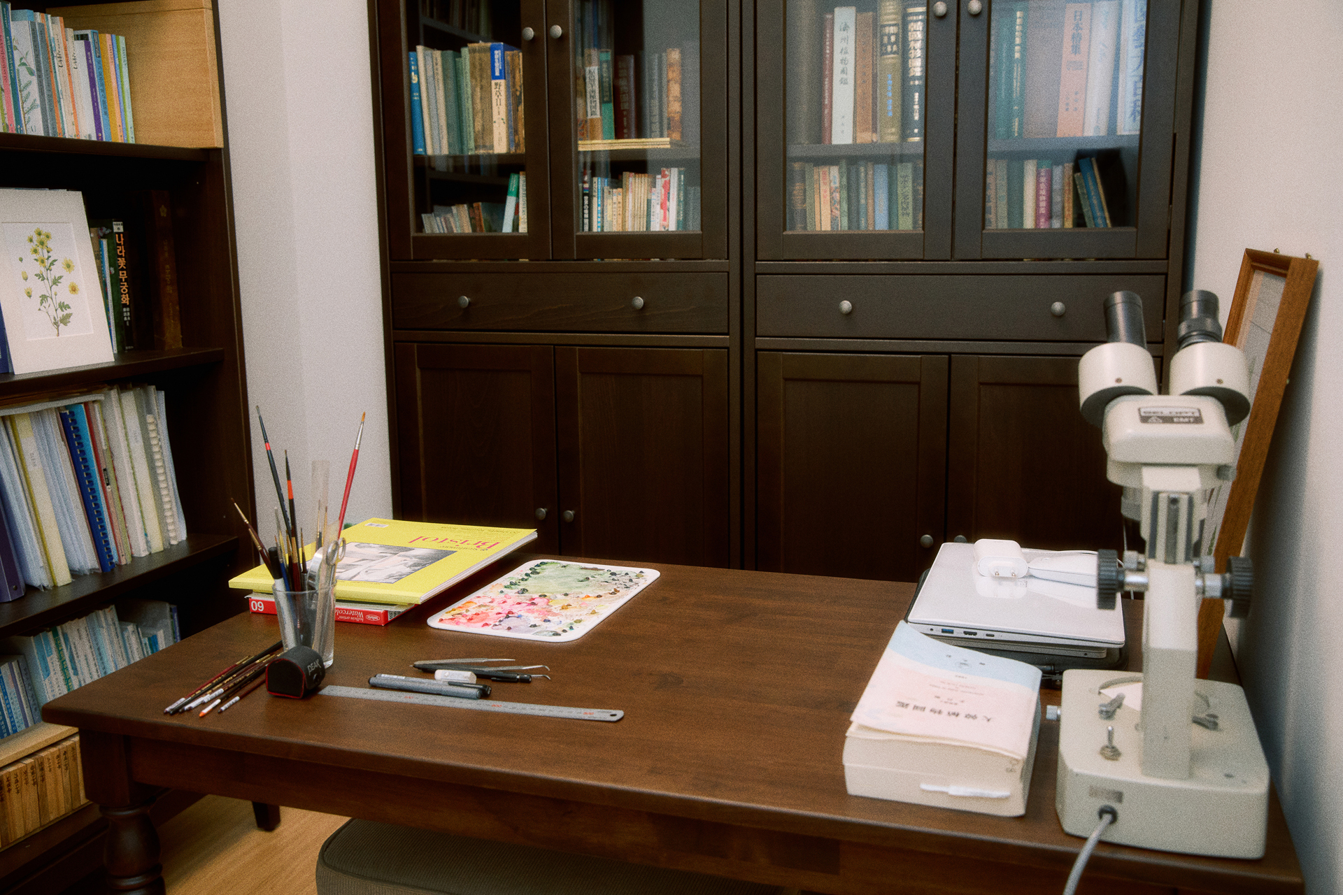 그는 대학교에서 원예학을 전공하면서 식물 세밀화에 처음 눈을 떴다. 3학년 때 수목학 수업 과제로 교정의 나무를 그려 도감을 만들었는데, 이를 본 교수님이 식물 세밀화를 권유했다. 졸업 후에는 국립수목원 식물표본관에 들어가 본격적으로 식물 세밀화를 그리기 시작했다. “첫 직장인 국립수목원은 우리나라에서 가장 오랫동안, 가장 많은 식물 데이터를 수집하고 보존하며 연구해 온 기관이에요. 선배 연구자들의 논문과 고서에 남아 있는 최초의 식물 기록을 찾아보며 많이 배우고 성장했어요.”