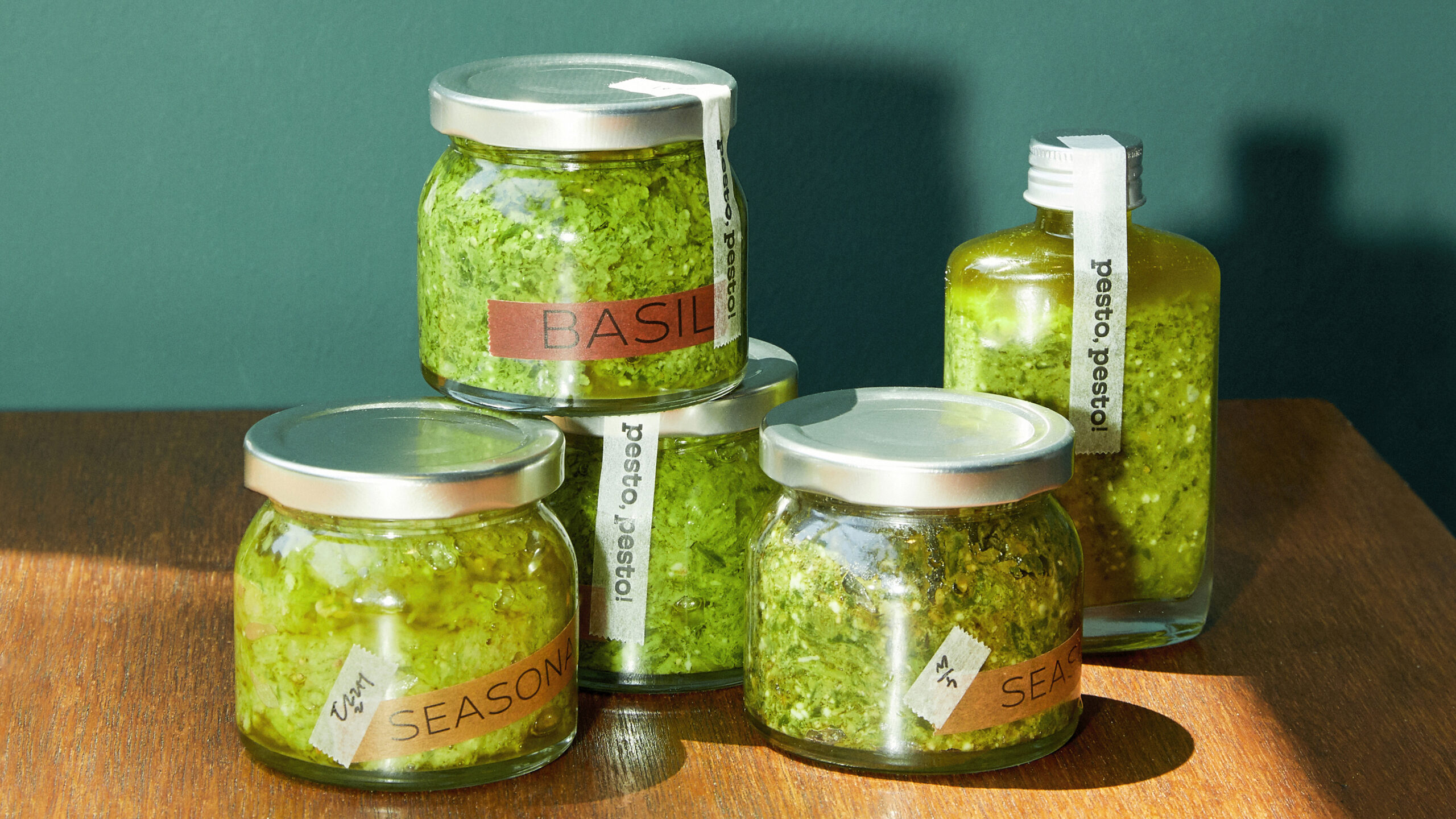 바질, 올리브 오일, 견과류, 각종 치즈 등을 혼합해 만드는 이탈리아의 대표 소스 중 하나예요. 저희 가게의 페스토는 방부제를 비롯한 첨가물 없이 모든 과정을 수제로 만들기 때문에 제작한 다음 날까지 판매하는 것을 원칙으로 하고 있어요. 손님들에게 개봉한 후에는 2주 안에, 개봉하지 않았어도 한 달 안에 드시라고 안내하고 있고요. 비건 손님들이 미리 요청하면 치즈를 빼고 비건용 페스토를 만들어 드리기도 합니다.