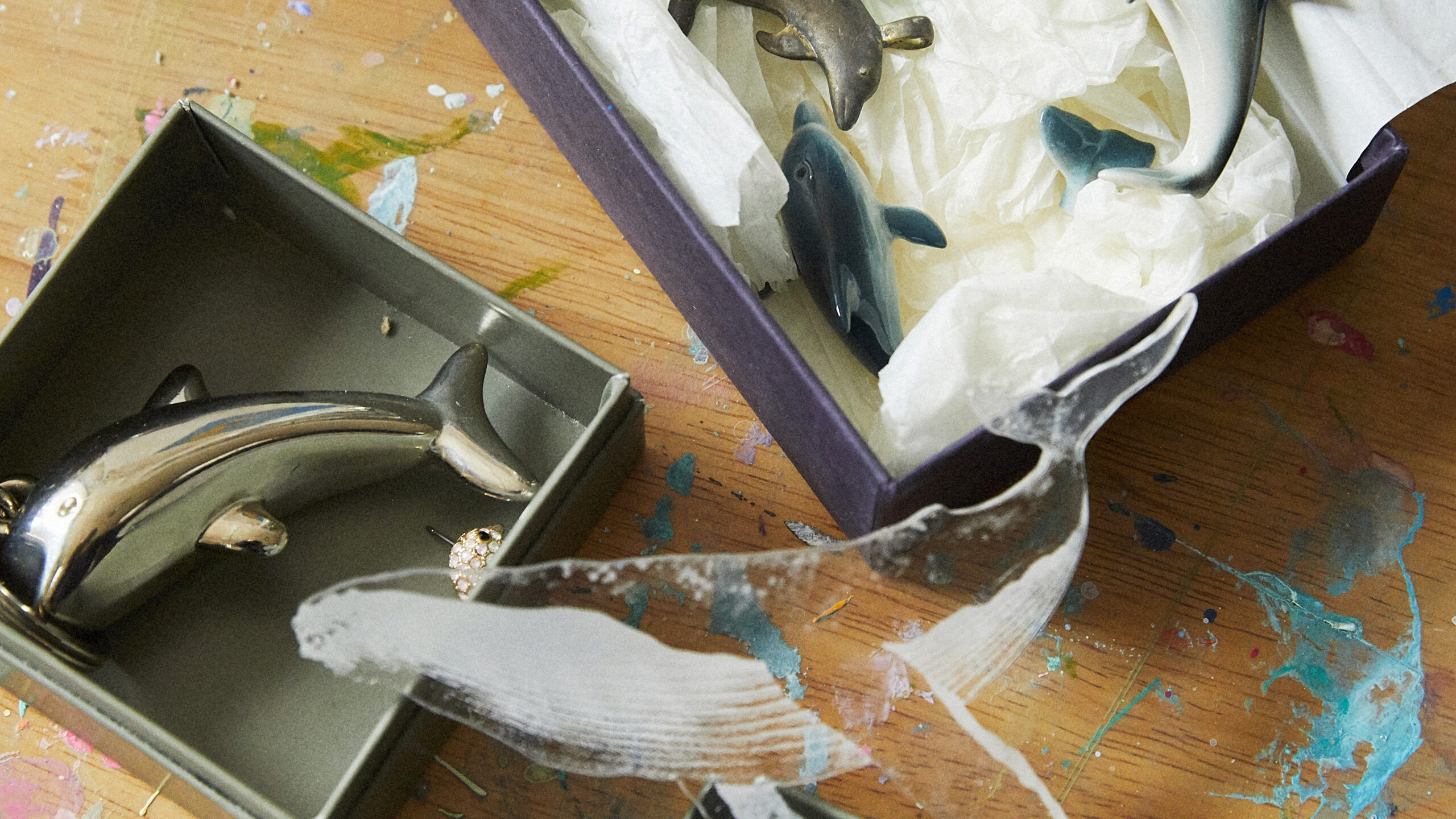 프리다 칼로와 원숭이, 데이비드 호크니와 물, 구사마 야오이와 동그라미. 이와 같이 작가에게는 각자 깊게 파고드는 소재가 있다. 진청에게 그 대상은 돌고래다. 그가 돌고래를 그리게 된 이야기는 열두 살 때로 거슬러 올라간다. 가족 여행으로 간 미국 바하마 섬에서 어린 진청은 5분짜리 ‘돌고래와 수영하기’ 체험 프로그램에 참가한다. “그때 돌고래 피부에 닿던 손의 감각이 아직도 정말 생생해요. 마치 공기로 꽉 찬 풍선을 만지는 듯한 느낌이었어요.” 진청은 그날 완전히 돌고래에게 반해 버렸고, 돌고래 모양으로 만든 거라면 뭐든 모으기 시작했다. “돌고래를 향한 제 사랑은 공공연한 사실이라 가족, 친구들도 돌고래와 관련된 물건만 보면 까마귀처럼 가져다줘요.” 그렇게 그의 책상에는 돌고래가 주인공인 소설과 영화 DVD, 돌고래 스티커, 돌고래 반지와 귀고리, 돌고래 키링 등이 17년간 쌓여갔다.