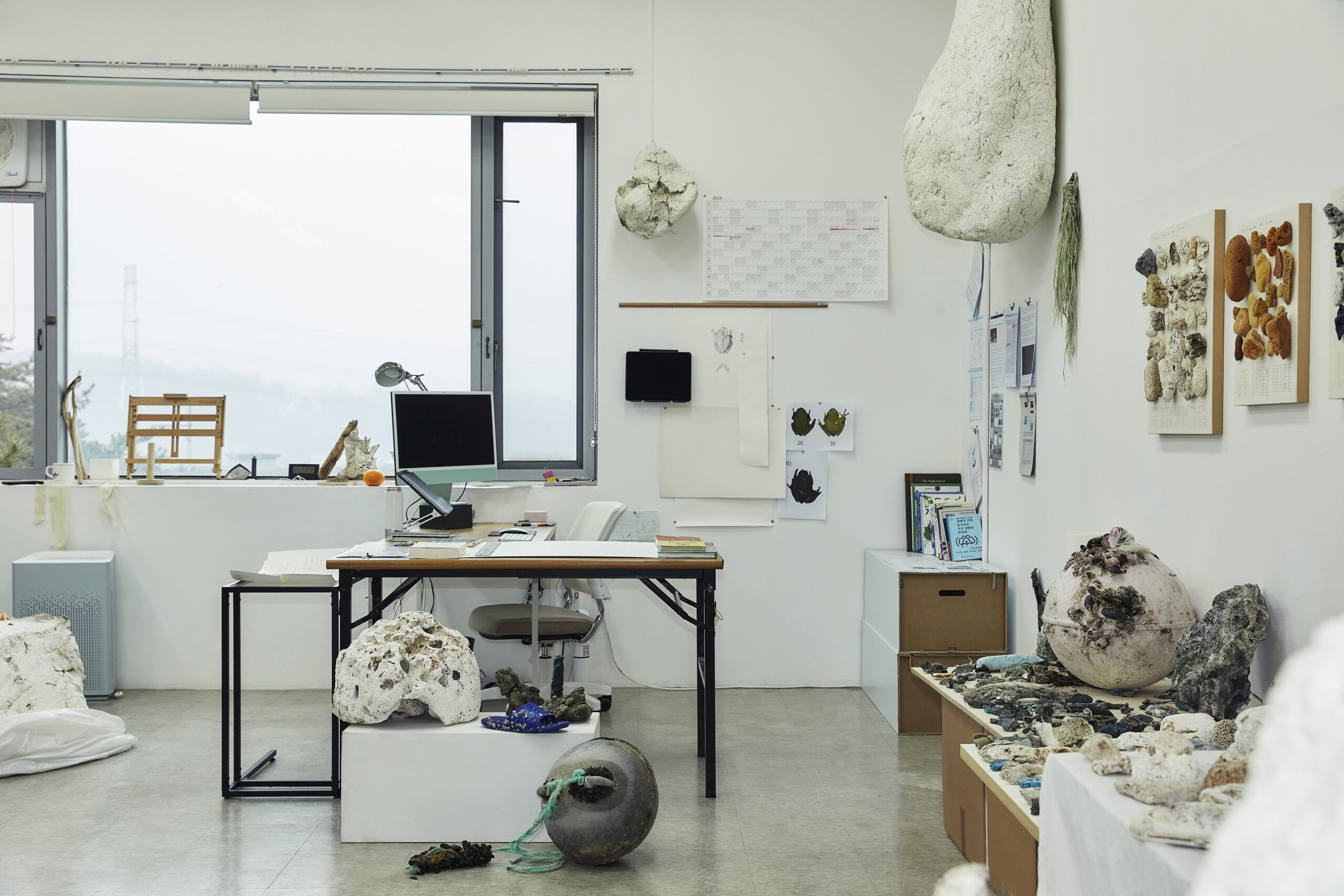 그는 올해 들어 국립현대미술관 고양 레지던시에 입주했다. 상수동에 있던 6평 남짓한 작업실보다 훨씬 넓은 이곳에 책상을 3개나 들여놓았다. 그 위에 바닷가에 굴러다니던 쓰레기들이 감각적으로 전시돼 있다. 그가 고른 쓰레기들은 미적으로 아름답다. “이 오브제들에 ‘뉴 락’이라는 이름을 붙인 건 그만큼 상징적인 의미가 있어서예요. 사람들은 본능적으로 소비하고 싶은 예쁜 이미지에 끌리죠. 저마다의 미감이 있는 쓰레기를 수집해 미학적으로 전시하는 건 그래서예요. 환경에 관심이 많은 소수의 사람이 아니라 더 많은 대중에게 가 닿고 싶어요.”