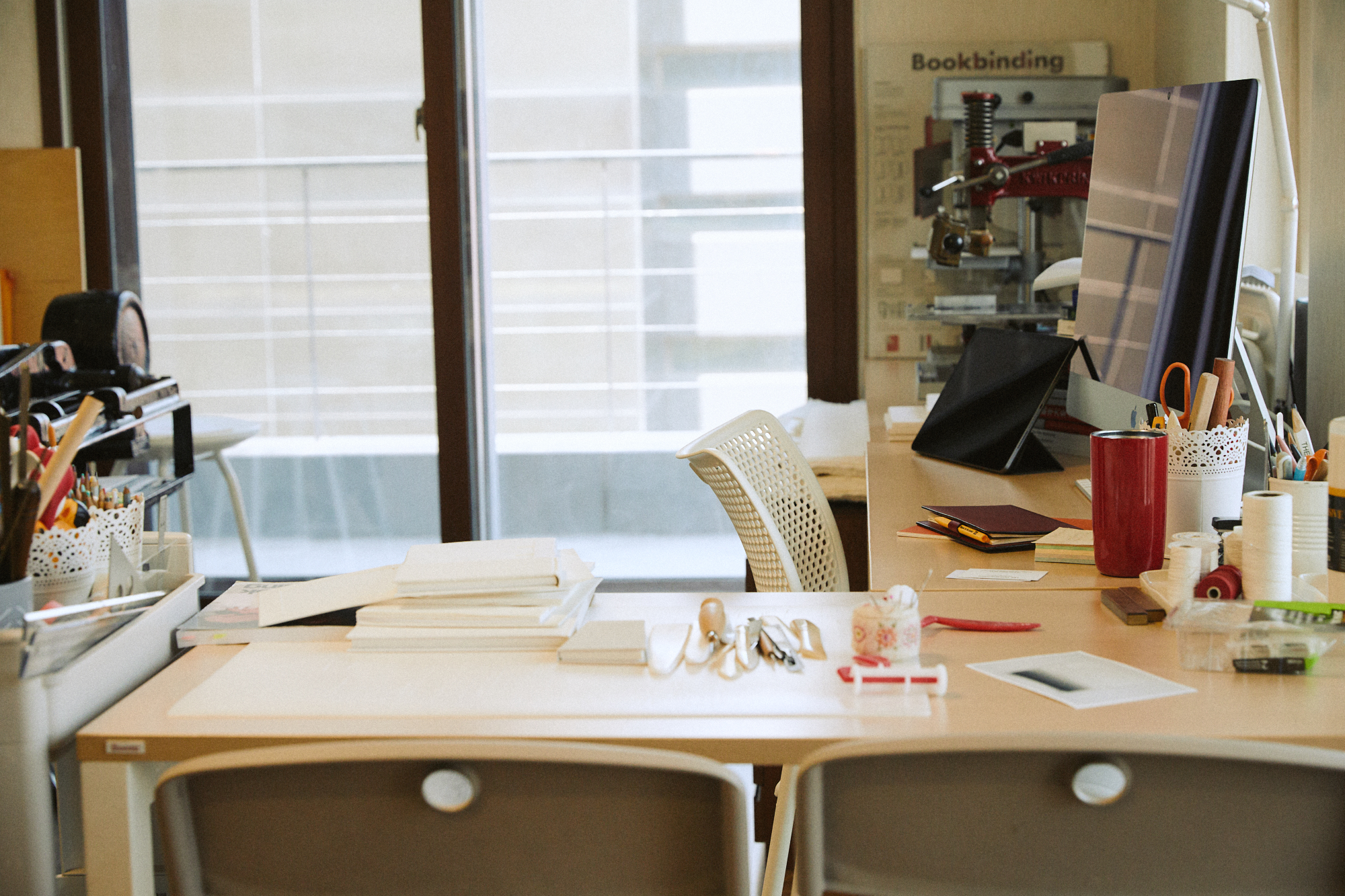 유학을 마치고 한국으로 돌아와 북 오브제를 만드는 공방 ‘사사로운 서가’를 연 것이 10년 전이다. 그때부터 책상 3개와 거대한 작두는 그가 수시로 사용하는 작업대 역할을 한다. 그 위엔 책을 누르는 북 프레스와 누름돌, 제목을 찍는 핫 스탬퍼 등의 갖가지 도구가 가지런히 놓여 있다. “표지를 만들 때 필요한 작두는 미국에서 샀어요. 성인 5명이 붙어도 옮기기 힘들 만큼 크고 무거워서 들여놓는 데 애를 먹었죠. 다른 도구들도 꽤 무거운 편이라 하중을 견딜 수 있도록 철제 빔 구조의 책상을 골랐고요.”