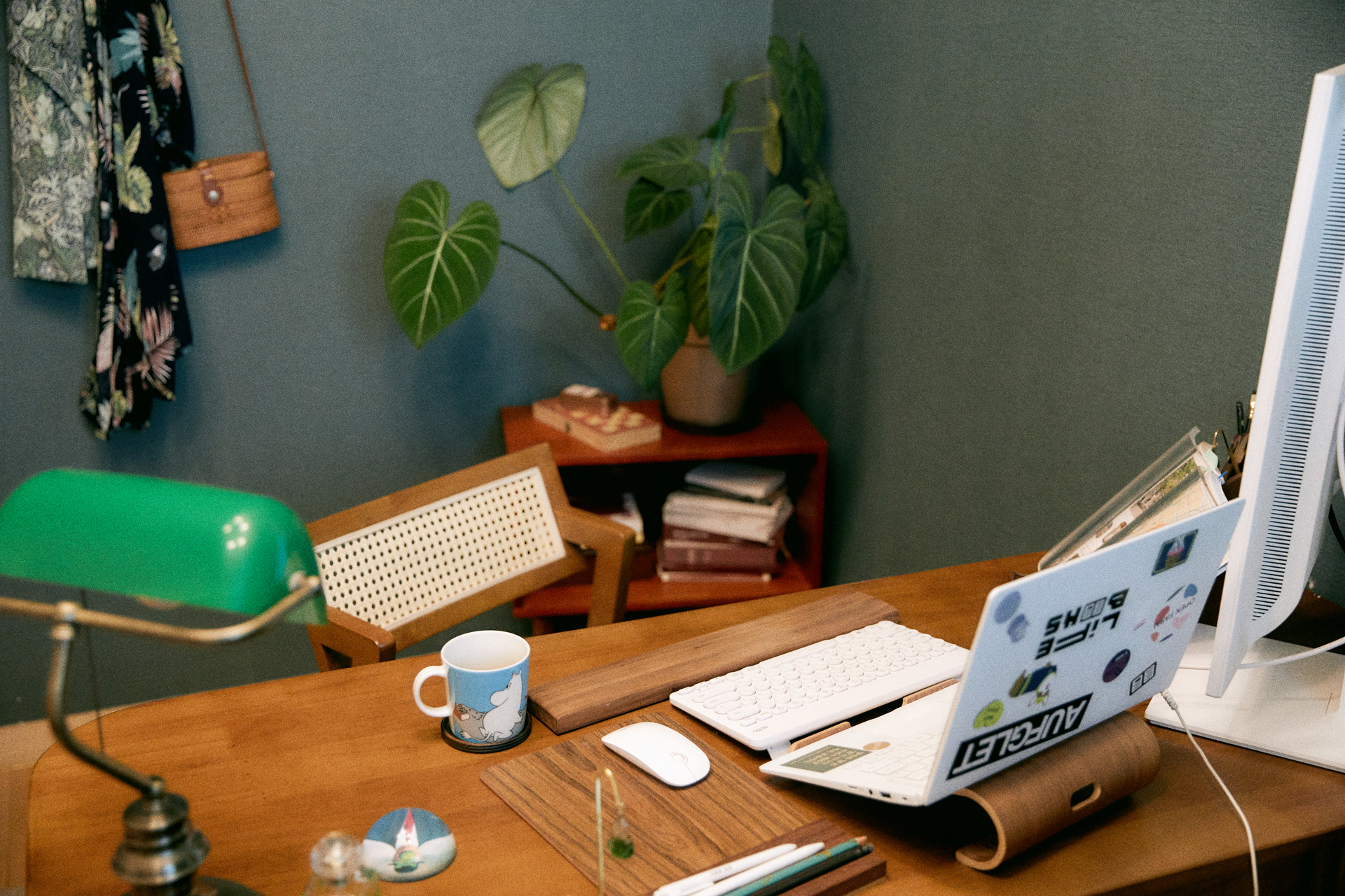 우지경은 여행 경력 27년 차의 베테랑 여행 작가다. 가이드북과 에세이를 포함해 펴낸 책만 총 9권이다. 그런 그에게 책상은 수없이 많은 곳으로 여행을 떠났다가도 마침내 돌아오는 장소다. “처음엔 카페에서, 급할 땐 비행기에서 일한 적도 있지만, 언제든 마음 편히 앉을 수 있는 지정석은 내 책상뿐이더라고요.” 그는 매일 오전 평상복으로 갈아입고 커피 한 잔을 내려 서재로 출근한다. “4년 전 이 집으로 오면서 서재를 새로 꾸렸어요. ‘식물을 좋아하는 주인장의 빈티지 북 카페’를 콘셉트로 삼았죠. 인테리어 공사 직전에 간 대만 타이베이의 티 하우스에서 영감을 얻어 초록색 벽지를 백방으로 찾았어요.”