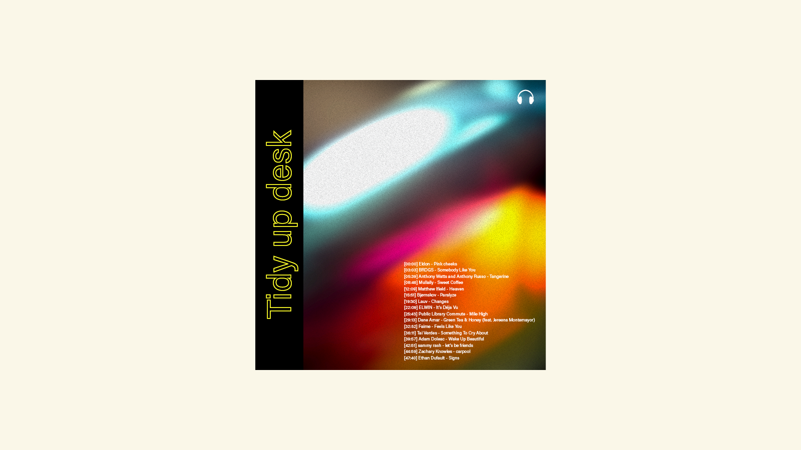 어지럽혀진 책상에는 보물이 숨겨져 있어요. 노트 아래 자리한 만년필, 책 더미에 가려진 스톱워치와 아이디어를 기록해둔 포스트잇 등 업무 집중도를 높여주는 나만의 애착 도구들이죠. 내 안에 숨겨진 열정을 되찾듯 책상 정리를 통해 나만의 도구를 발굴해 보세요. 선뜻 몸이 움직이지 않는다고요? 그럴 땐 differ가 준비한 플레이리스트에 몸을 맡겨 봐요. 부드러운 선율과 리듬이 정리의 도구가 되어, 손을 움직이게 될 테니까요. 금세 말끔해진 책상 위로 나의 도구를 가지런히 진열하면, 업무로의 딥 다이브 준비 완료!