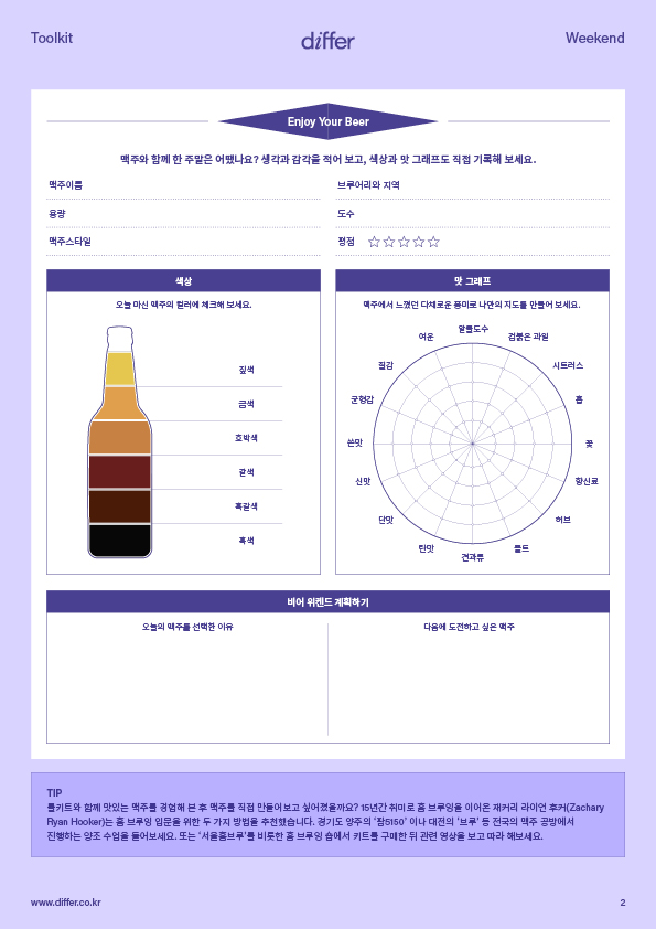 이번 주말엔 시원한 맥주 한 잔을 들이켜며 느긋하게 쉬어볼까요? 지난 한 주의 성취를 축하하고 실수는 잠시 잊으며, 나만의 맥주 기록을 남겨보는 거예요. 기록이 쌓일수록 나의 맥주 취향이 선명히 보일 거예요.