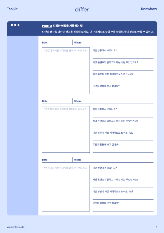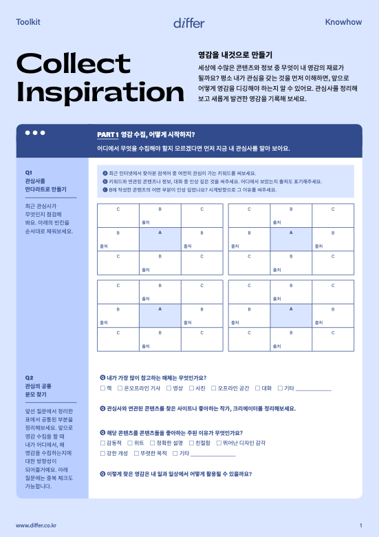 어디에서부터 영감을 찾아야 할지 모르겠나요? 평소 자신의 관심사에서부터 시작해 볼 것을 권해요. 평소 내가 매력을 느끼는 것을 정리하고 새롭게 디깅한 영감을 기록으로 남겨 보세요.