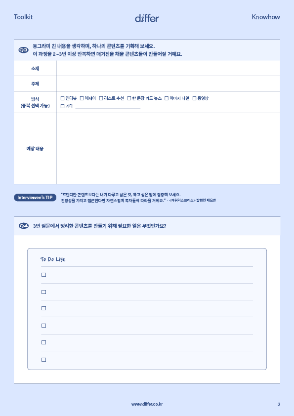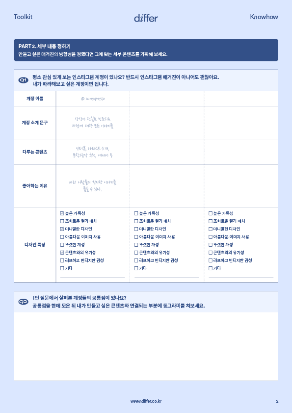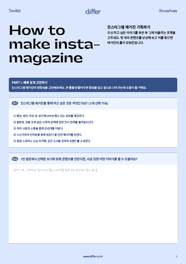 인스타그램 매거진을 시작하기 위해선 기획이 필요합니다. 무슨 콘텐츠를 위주로 매체를 꾸릴지, 어떤 메시지를 전달하고 싶은지, 그에 맞는 포맷은 무엇인지 고민해야 하는데요. 아직 어렵게 느껴진다고요? 툴키트 속 질문이 길잡이가 되어, 내 무의식에 있는 막연한 생각을 일목요연하게 정리해줄 거예요.