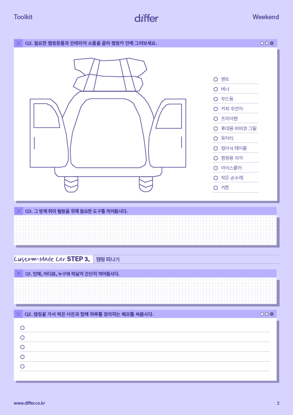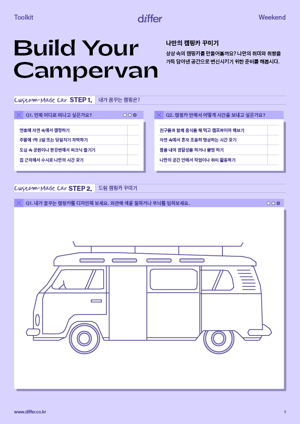 출퇴근용으로만 쓰던 차량을 낭만 있게 바꿔봅시다. 지저분한 곳은 청소하고, 멀리 떠나기 위해 필요한 것들을 구매해 알차게 채워보세요. 나만의 캠핑카로, 어디서든 분위기를 환기할 수 있도록!