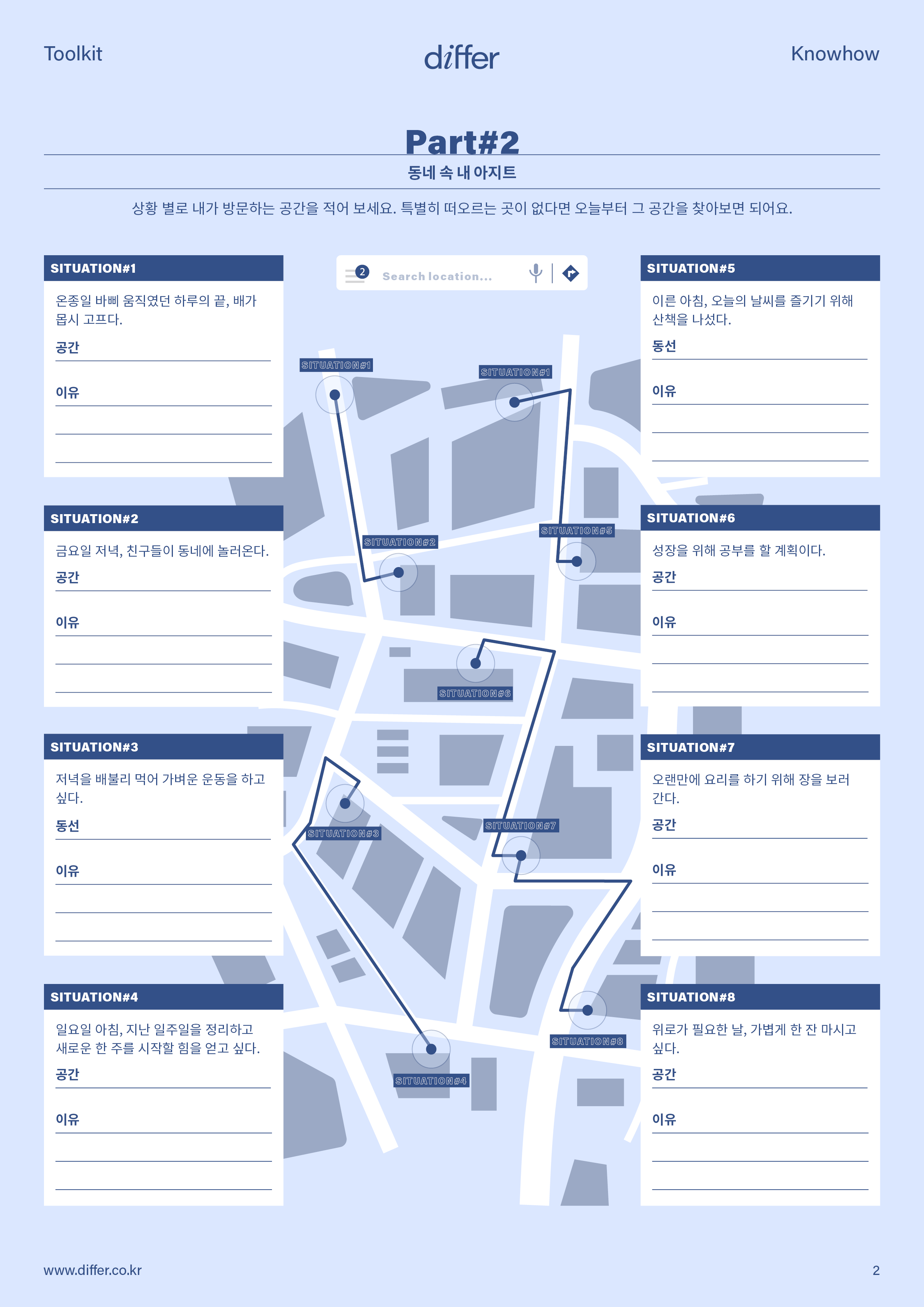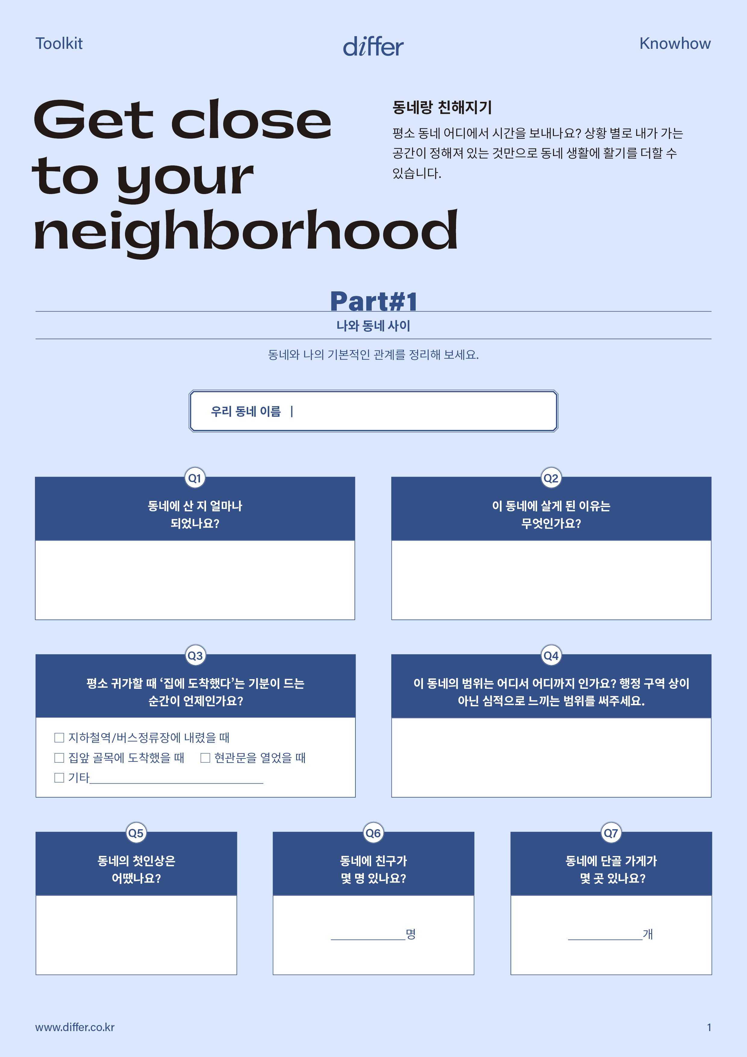 내가 지금 살고 있는 동네에 애정을 갖고 싶다면 툴키트에 답을 채워보세요. 자주 가던 단골집, 산책로, 퇴근길 등을 정리하며 동네 구석구석을 떠올리다 보면 나와 동네의 거리를 좁힐 수 있어요. 아는 만큼 더 사랑하게 되니까요.
